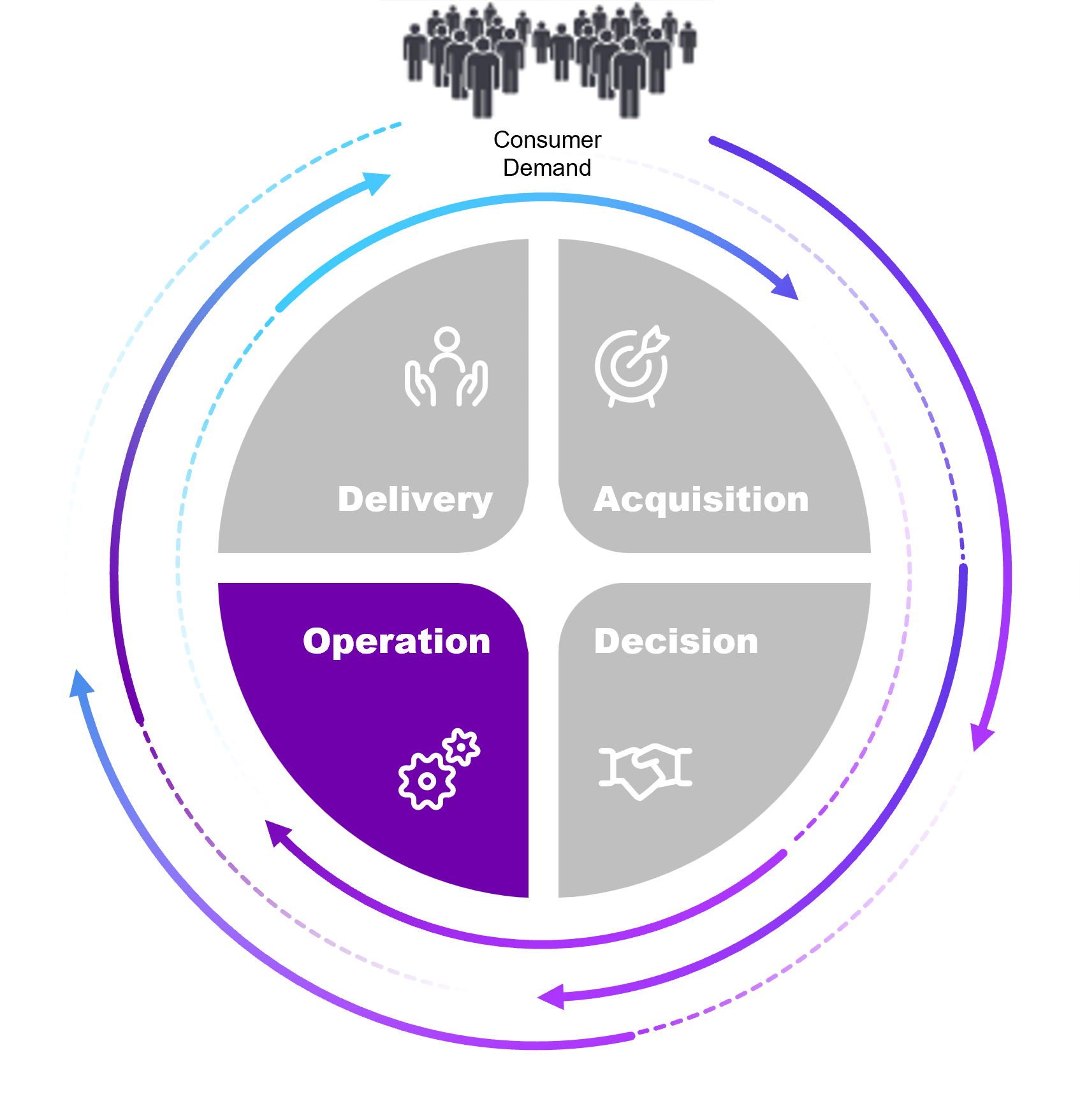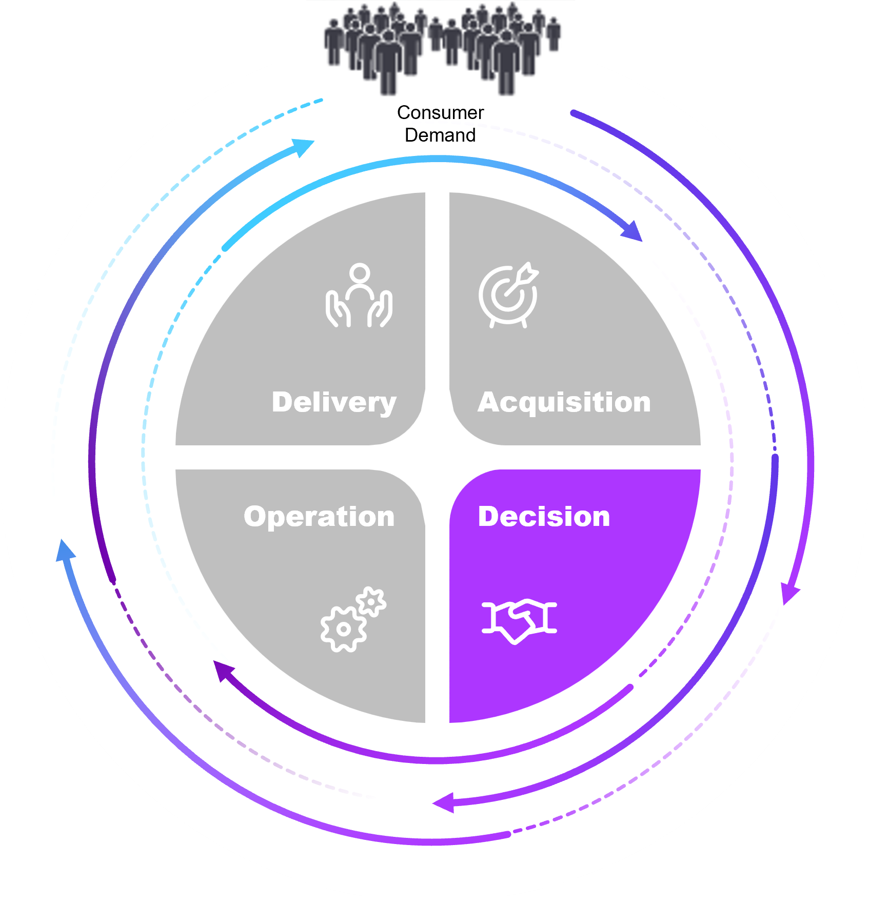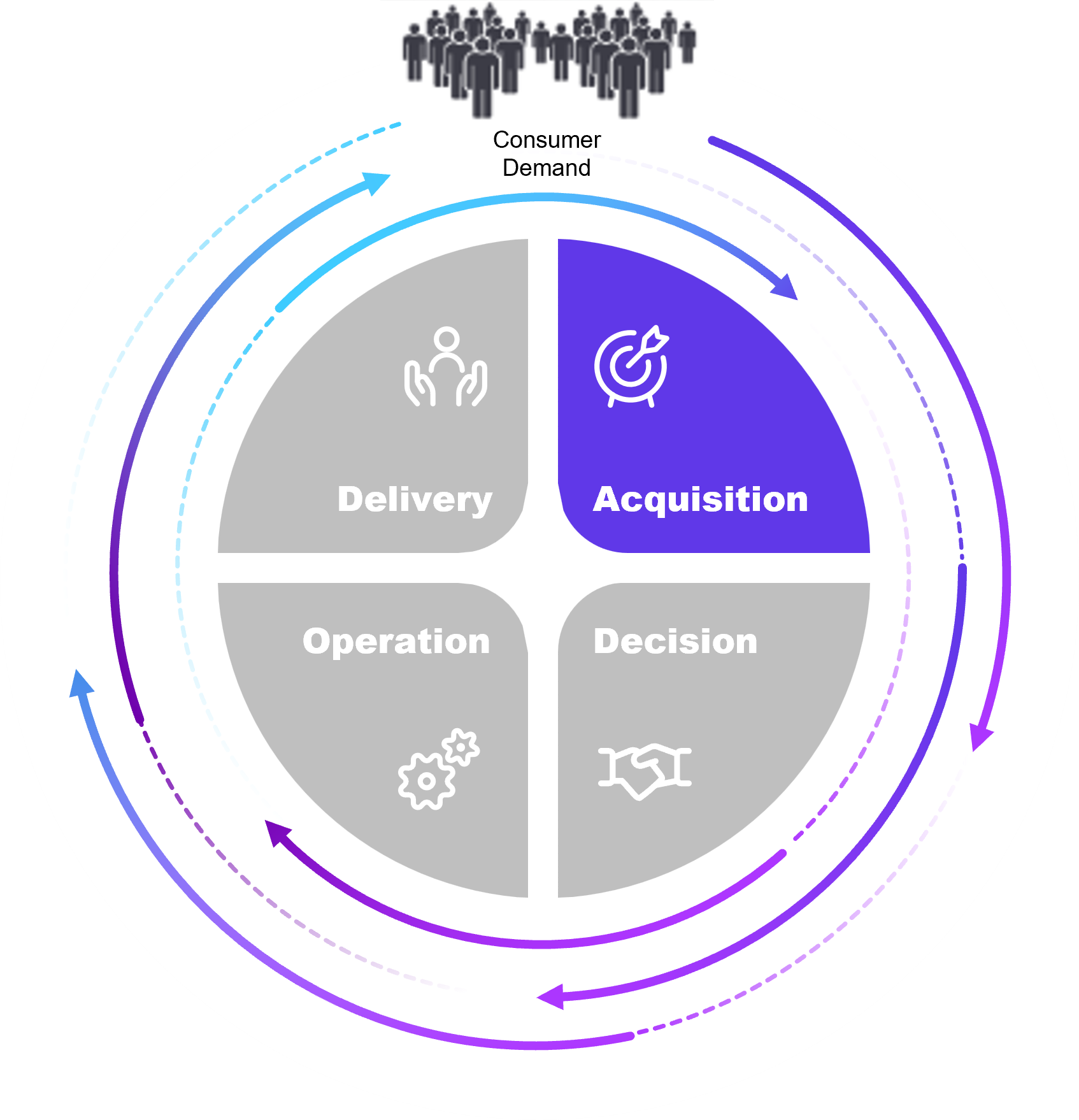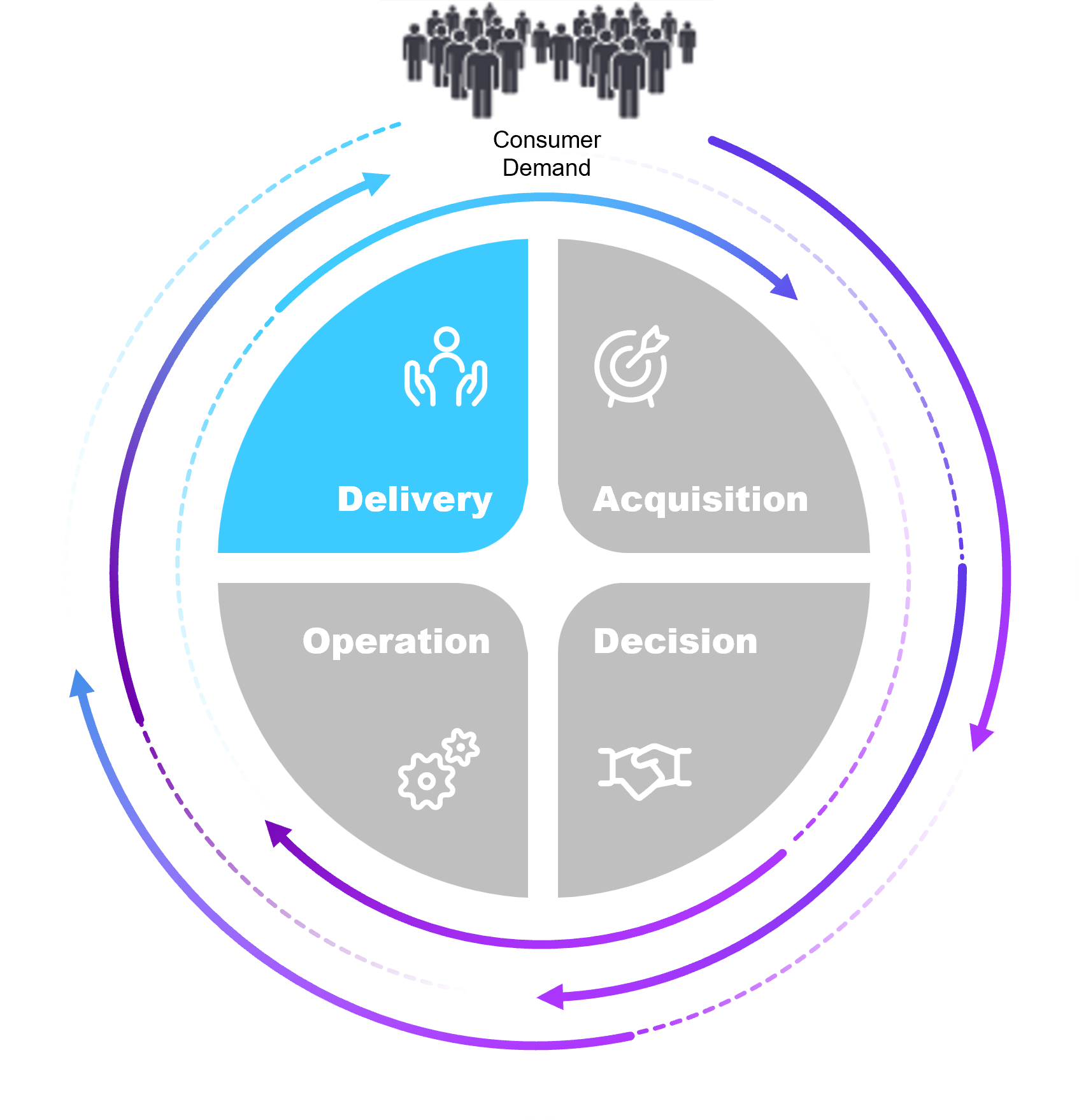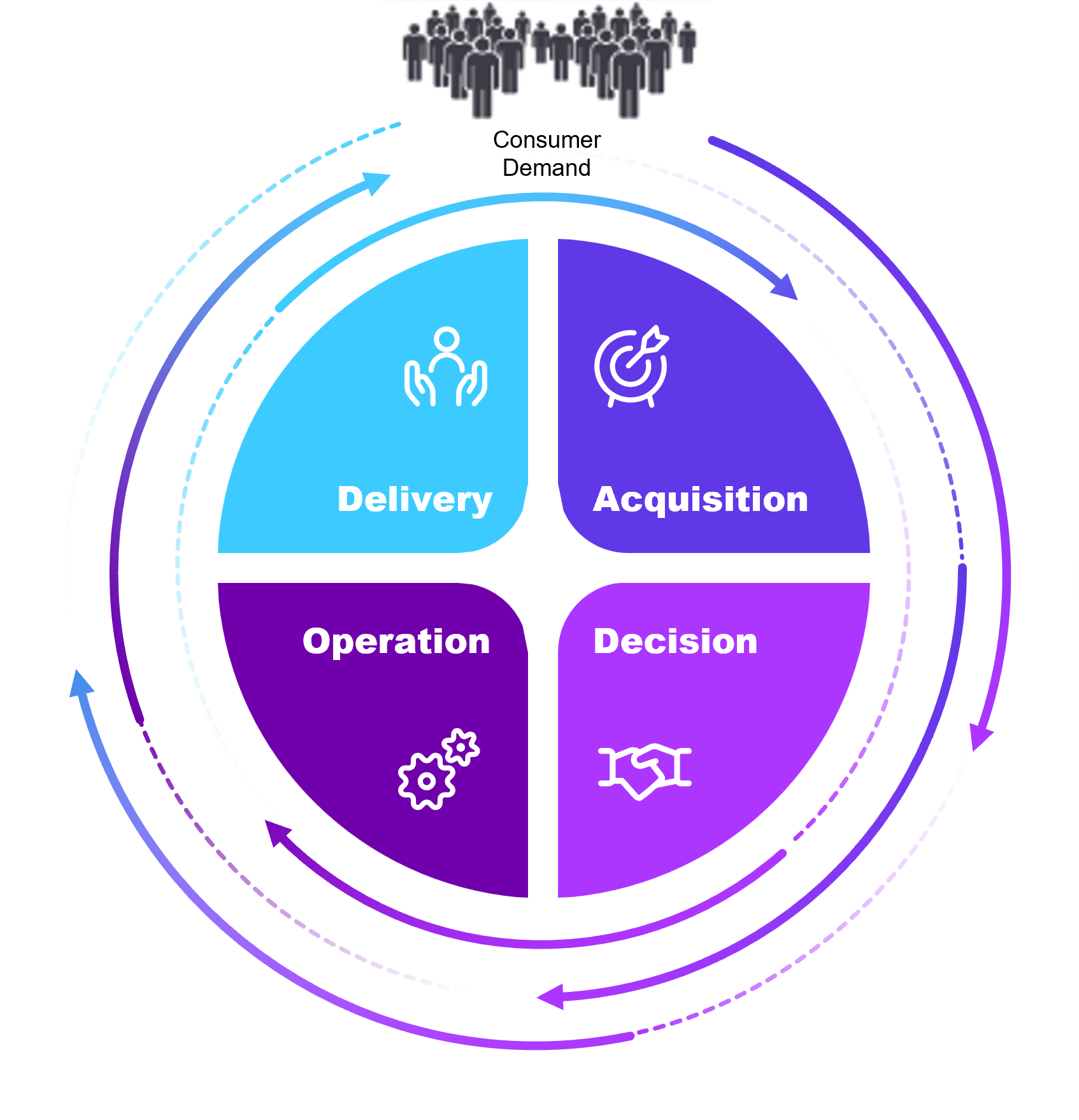 Circular diagram labeled "Consumer Demand" at the top, with four inner segments: Delivery, Acquisition, Decision, and Operation. Surrounding the circle are four supporting value statements:  Reach more consumers (Real-time Inventory, POS Integration, Reporting)  Grow brand presence (Catalog Syndication, Dealer Onboarding, Engagement Tracking)  Accelerate demand (Visualizer, Sampling, Galleries, Sample-to-Lead Routing)  Power smarter sales (ERP Data Sync, Multi-location Support, Data Validation)